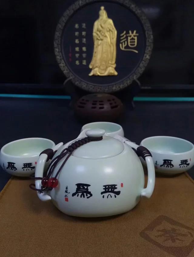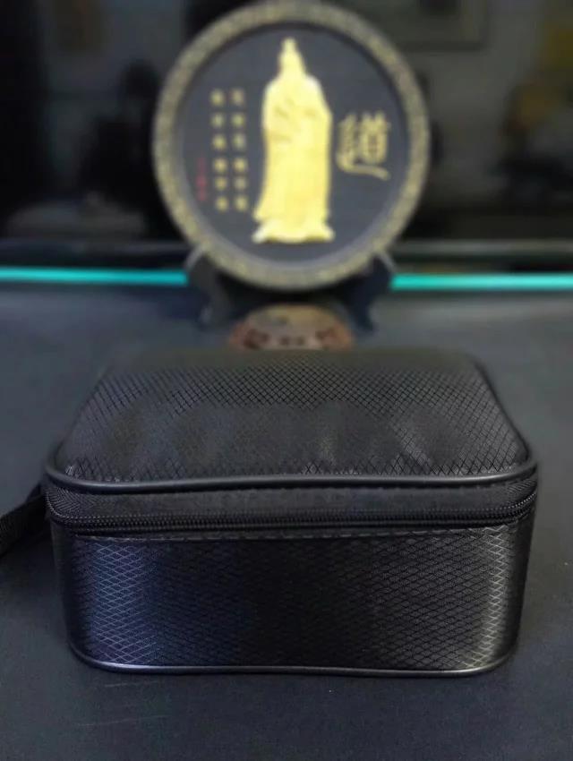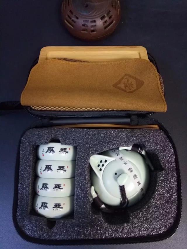 便攜式旅行包內(nèi)有茶壺一枚,茶杯四枚,茶巾一塊,茶盤一個,茶夾一枚。汝窯名瓷,手工制作。