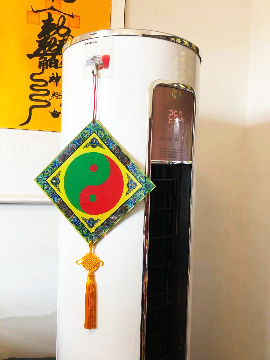 西北方有空調(diào)掛在西北方:中間太極圖木生火、火生土,土旺生扶乾金,對(duì)乾宮直接有利,利于家中財(cái)運(yùn),黃色底盤(pán)上祥云福圖寓意吉祥。
