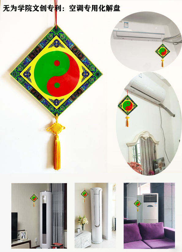 針對(duì)以上問(wèn)題專(zhuān)業(yè)的傳統(tǒng)文化研究機(jī)構(gòu)——無(wú)為學(xué)院文創(chuàng)部在數(shù)位老師的共同努力下研制開(kāi)發(fā)的專(zhuān)利產(chǎn)品【空調(diào)化解盤(pán)】誕生了,該產(chǎn)品是由優(yōu)質(zhì)亞克力水晶精制而成,雙面均有綠紅太極圖和祥云、福圖、云篆等花紋組成,其化解理念是根據(jù)太極圖中的木(綠)生火(紅),然后生底盤(pán)土(黃),層層相生,泄掉空調(diào)的風(fēng)(木),其理論符合易理,經(jīng)得起推敲,經(jīng)過(guò)實(shí)踐應(yīng)用效果顯著,懸掛在空調(diào)附近或出風(fēng)口。以陰陽(yáng)學(xué)說(shuō)、五行學(xué)說(shuō)和天人合一的理論為指導(dǎo),以后天八卦為依據(jù),化繁為簡(jiǎn),反樸歸初,去偽存真,道理簡(jiǎn)單,方法明確實(shí)用性強(qiáng),效果明顯,立竿見(jiàn)影。