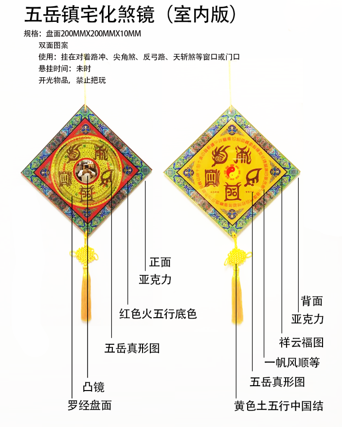 【五岳鎮(zhèn)宅化煞鏡】采用優(yōu)質(zhì)亞克力精加工而成,尺寸200X200毫米,厚度10毫米左右。有效的避免了因化煞物品本身材質(zhì)五行造成的方位相克的困惑,上面有兩面圖案,正面有風(fēng)水羅經(jīng)和五岳真形圖組合圖案,背面有五岳真形圖、八卦和小篆文一帆風(fēng)順、二龍騰飛、三陽開泰、四季平安、五福臨門等祝意。經(jīng)過開光加持和在神龕祭煉其能量很大。