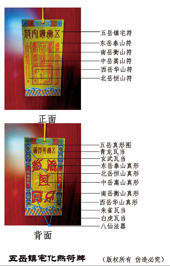 無為學院文創(chuàng)部新近開發(fā)的【五岳鎮(zhèn)宅化煞符牌】就是由易羊道長親自手繪的“五岳鎮(zhèn)宅符”和“五岳真形圖”組成,雙面多功能,經(jīng)過開光,能量倍增。