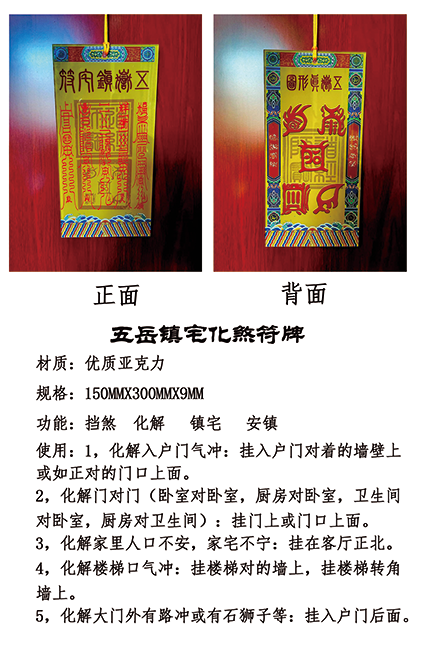 【五岳鎮(zhèn)宅化煞符牌】是用優(yōu)質(zhì)亞克力精制而成,雙面圖案,設(shè)計精美?梢曰馊霊糸T氣沖,門對門,樓梯轉(zhuǎn)角沖射等,能夠確保家宅安寧,人口平安,安定祥和!