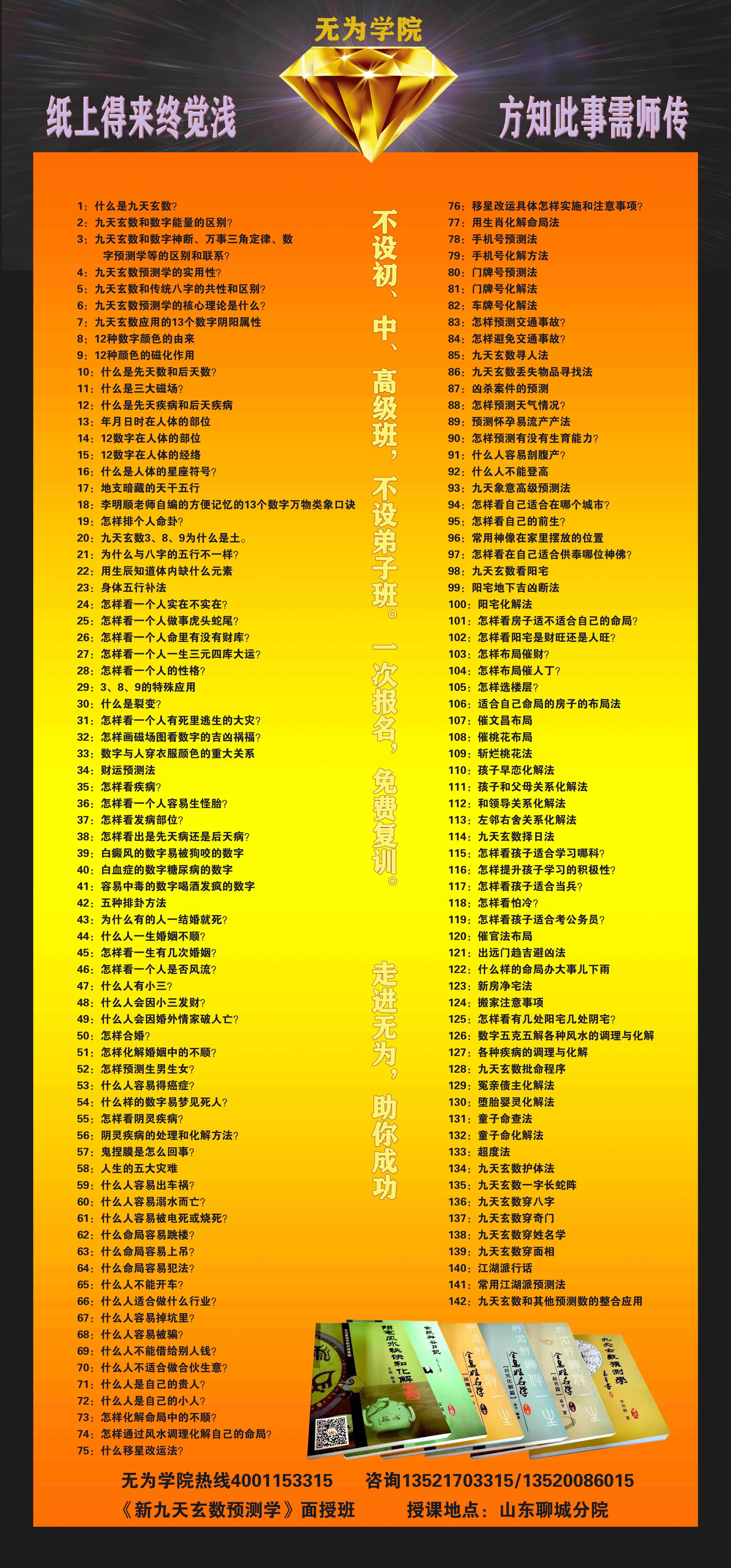 備受易學(xué)界關(guān)注的無為教育《九天玄數(shù)預(yù)測學(xué)》進(jìn)行了八年多的授課,得到了易學(xué)愛好者的贊許,其簡便、速斷、準(zhǔn)確、易學(xué)的特性得到了大家的青睞, 無為教育學(xué)院《九天玄數(shù)預(yù)測學(xué)》開班以來一直遵循最低價(jià)授課,一次性授課,不設(shè)初、中、高級班或弟子班釣魚式綁架,一次交費(fèi),永久免費(fèi)復(fù)訓(xùn),線上線下全打通,線上報(bào)名線下免費(fèi),線下報(bào)名線上免費(fèi),得到了很多易學(xué)愛好者的贊許和支持。