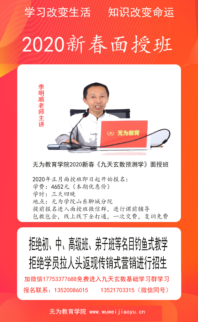 備受易學(xué)界關(guān)注的無(wú)為教育《九天玄數(shù)預(yù)測(cè)學(xué)》進(jìn)行了五年多的授課,得到了易學(xué)愛(ài)好者的贊許,其簡(jiǎn)便、速斷、準(zhǔn)確、易學(xué)的特性得到了大家的青睞,應(yīng)易友的紛紛要求無(wú)為學(xué)院在今年歲末再進(jìn)行一次《九天玄數(shù)預(yù)測(cè)學(xué)》的面授,定于2019年12月5日——7日在山東聊城進(jìn)行今年的最后一次專(zhuān)修班面授。