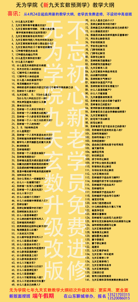 《新九天玄數(shù)預測學》面授班首期在4月24日已經(jīng)成功舉辦,學員爆滿,效果很好。應同學們要求特在【端午假期】三天進行第二期《新九天玄數(shù)》面授。請九天玄數(shù)愛好者提前預約報名:6月11日下午開始報到,6月15日上午離會,聯(lián)系報名13520086015,13521703315,微信同號。