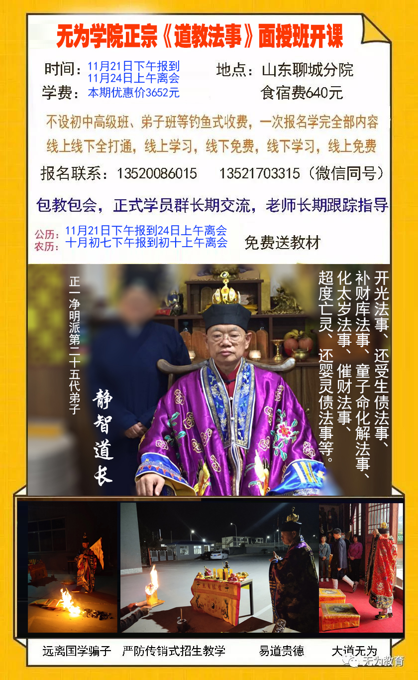 無為學院應易友要求特開設正宗《道教法事》面授班,由道教正一凈明派弟子靜智道長主講,主講內(nèi)容:常做的法事:開光法事、還受生債法事、補財庫法事、童子命化解法事、化太歲法事、催財法事、超度亡靈、還嬰靈債法事等。